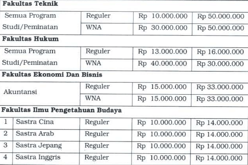 Bopb ini sama saja dengan ukt (uang kuliah tunggal) bahwa biaya pendidikan yang harus dibayarkan mahasiswa per semester selama masa. Penerapan sistem pembiayaan ukt di universitas indonesia sebenarnya sudah dimulai sejak lama dan disempurnakan pada tahun 2008 dengan nama bopb (biaya operasional pendidikan berkeadilan). Peraturan rektor ui no 4 tahun 2021 tentang biaya pendidikan mahasiswa non s1 reguler. Berikut ini informasi tentang biaya kuliah di universitas indonesia (ui). Biaya kuliah ui ditetapkan ditetapkan berdasar program pendidikan, bukan berdasar jalur masuk.